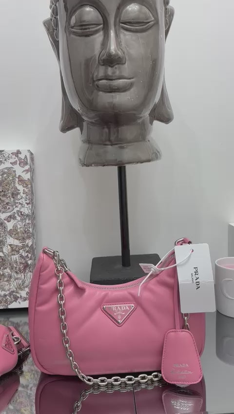 Nappa leather, padded design, enamel triangle with logo, top chain handle, silver-tone hardware, top zip closure, single compartment and internal logo plaque.